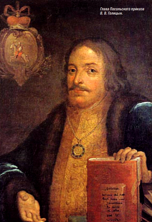 и Пушкарским приказами. Голицын уделял большое внимание укреплению связей со всеми европейскими дворами, а также с Китаем, с которым в 1689 г. в Нерчинске был подписан первый в истории российско-китайских отношений договор.