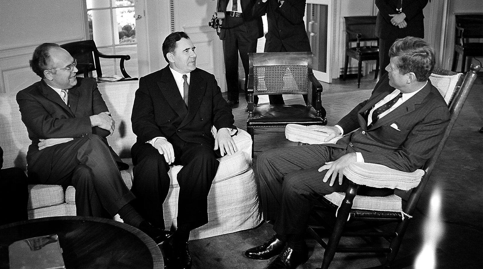 Посол СССР в Вашингтоне А.Ф.Добрынин, министр иностранных дел СССР А.А.Громыко на встрече с президентом США Дж.Кеннеди в Белом доме. 18 октября 1962 г.